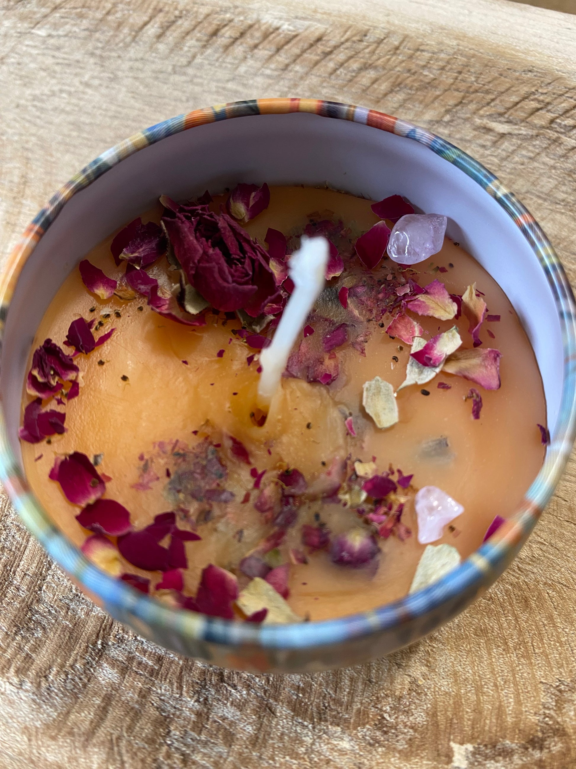 Bougie artisanale en cire de soja, ornée de quartz rose, citrine, lavande et pétales de rose.