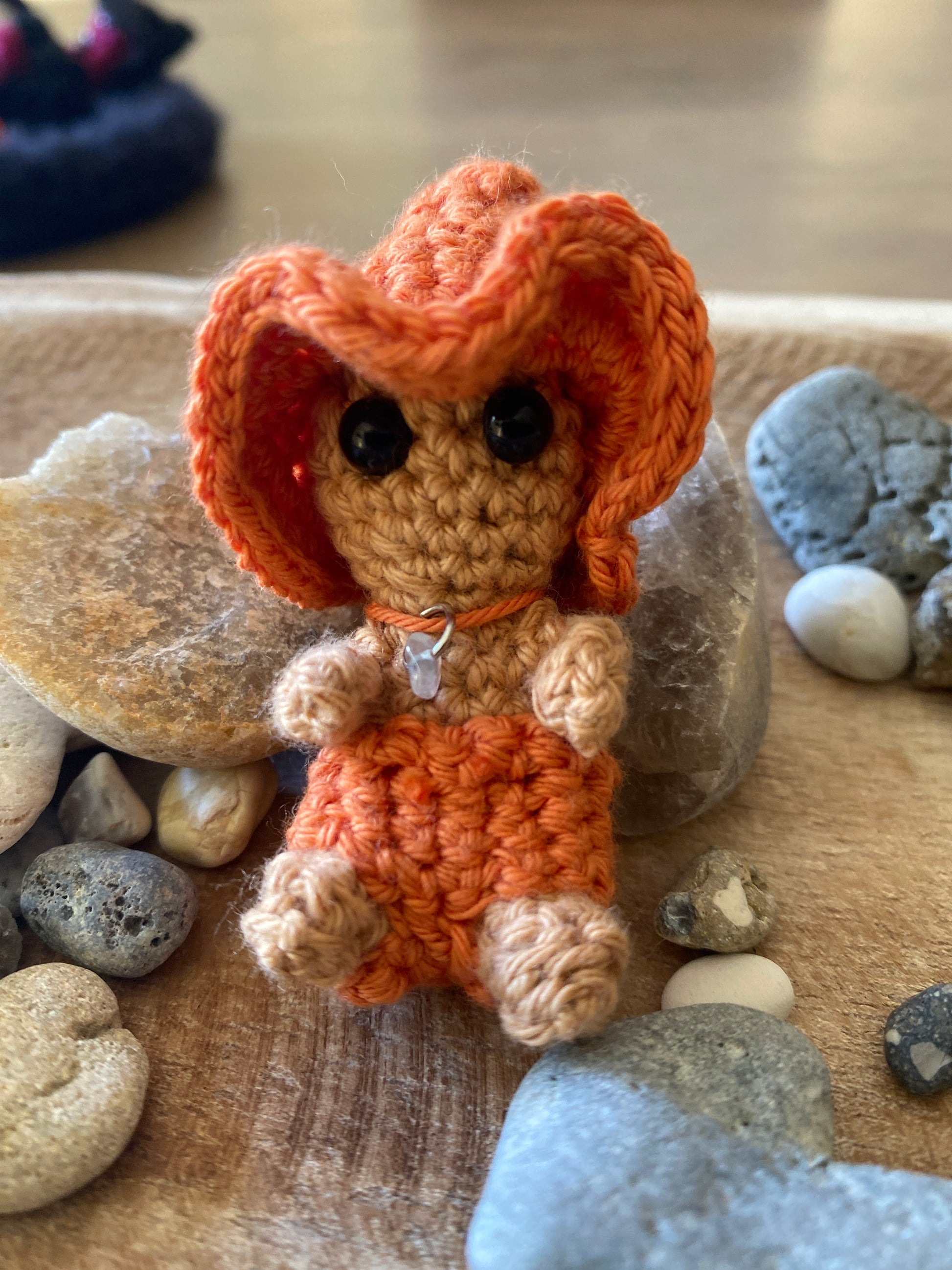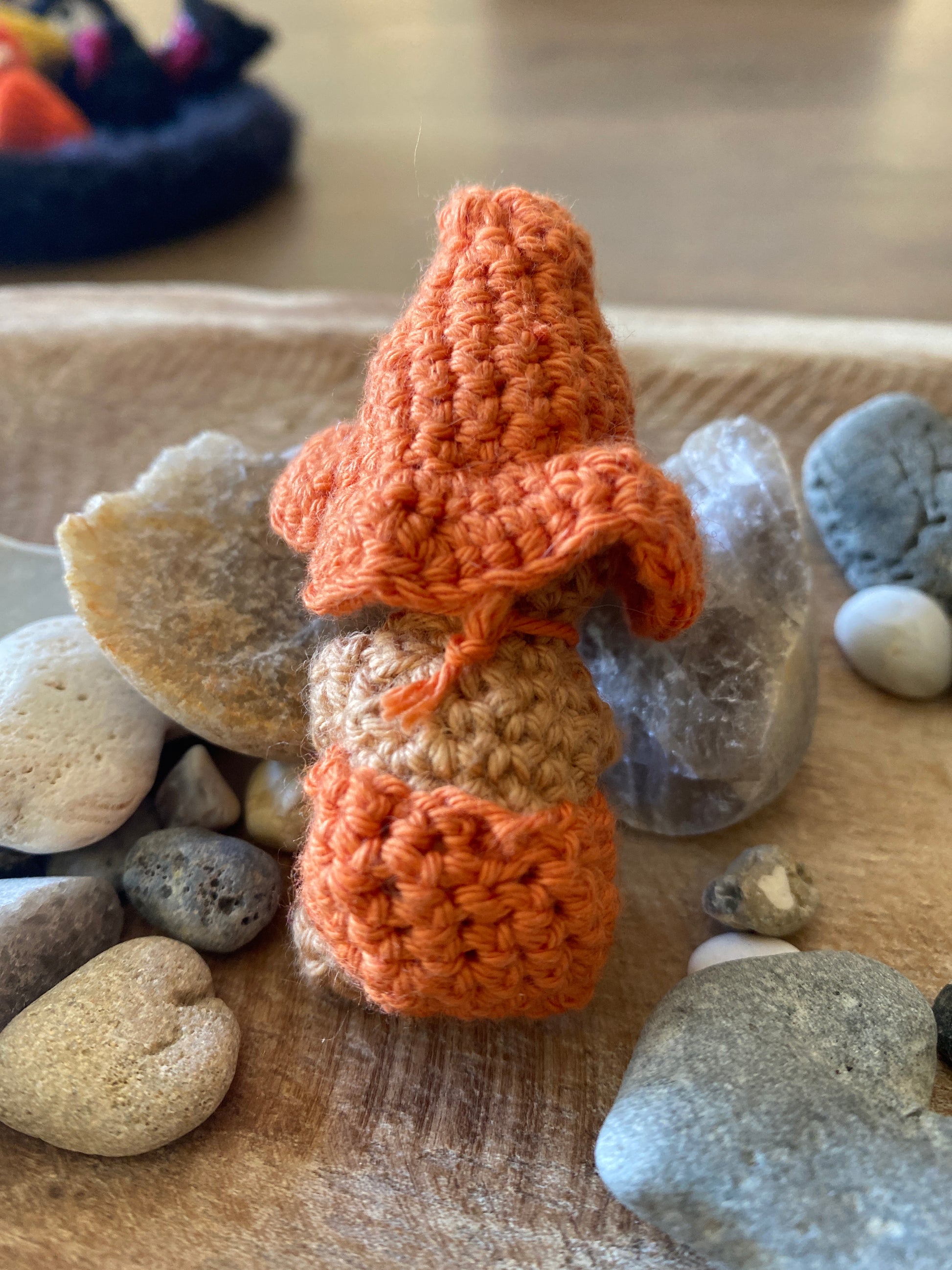 Sa culotte et son chapeau orange rappellent le feu du foyer : une énergie vivante, chaleureuse et protectrice, qui réconforte et rassemble.